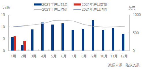 2021-2022年雙膠紙進口數(shù)量及均價對比圖